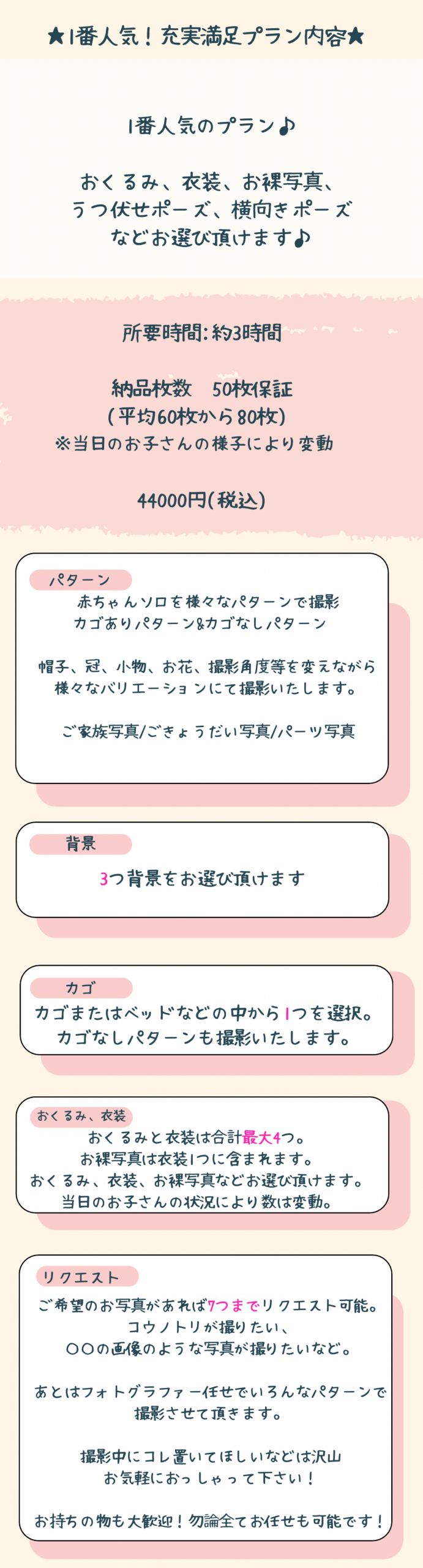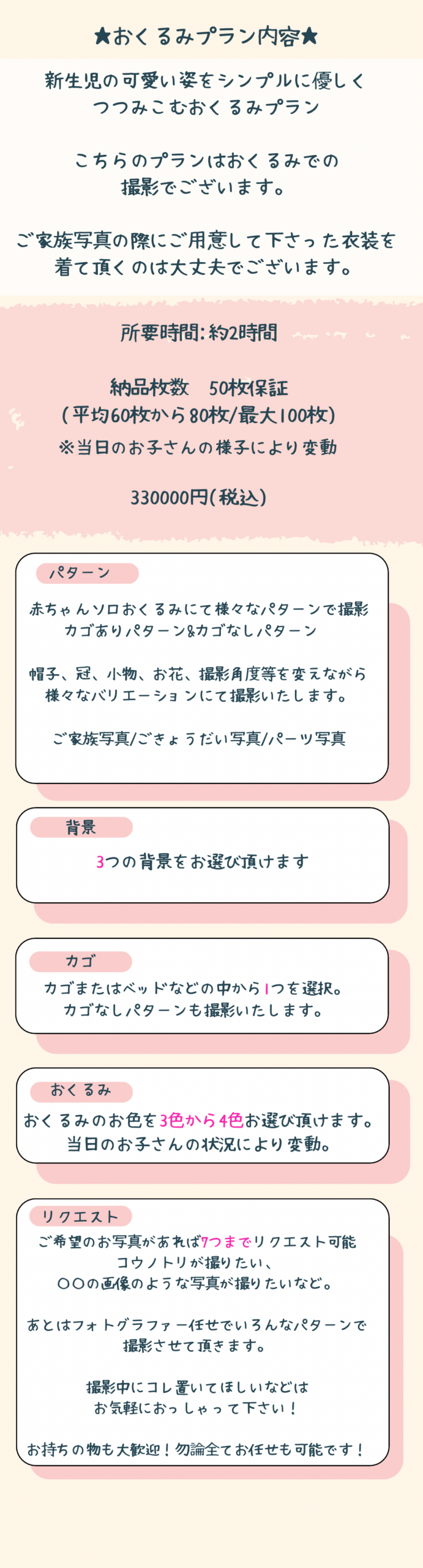 ⑤どのコースも納品枚数50枚保証でございますが撮影内容等が変わります。(平均60枚から80枚/最大100枚)当日のお子さんの様子により変動いたしますが沢山撮れた場合は沢山お渡ししております。