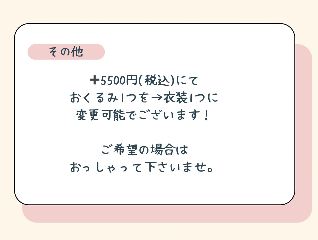 ⑨衣装男女あわせて10種類、おくるみ17色以上、その他小物や造花がございますが、絶対に着せたい衣装や小物、お花がある場合は