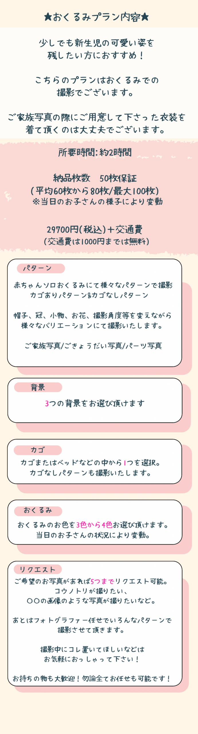 ニューボーンに限り交通費1000円までは無料!1000円以降は差額の交通費を頂戴いたします。(例①交通費900円の場合は無料。例②交通費1100円の場合は交通費100円)。