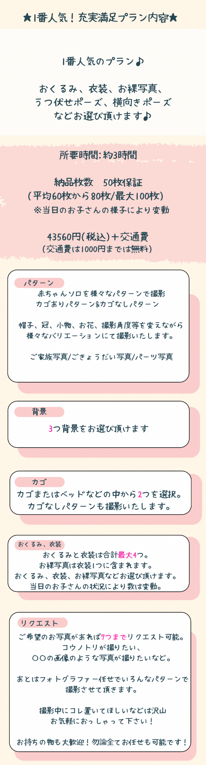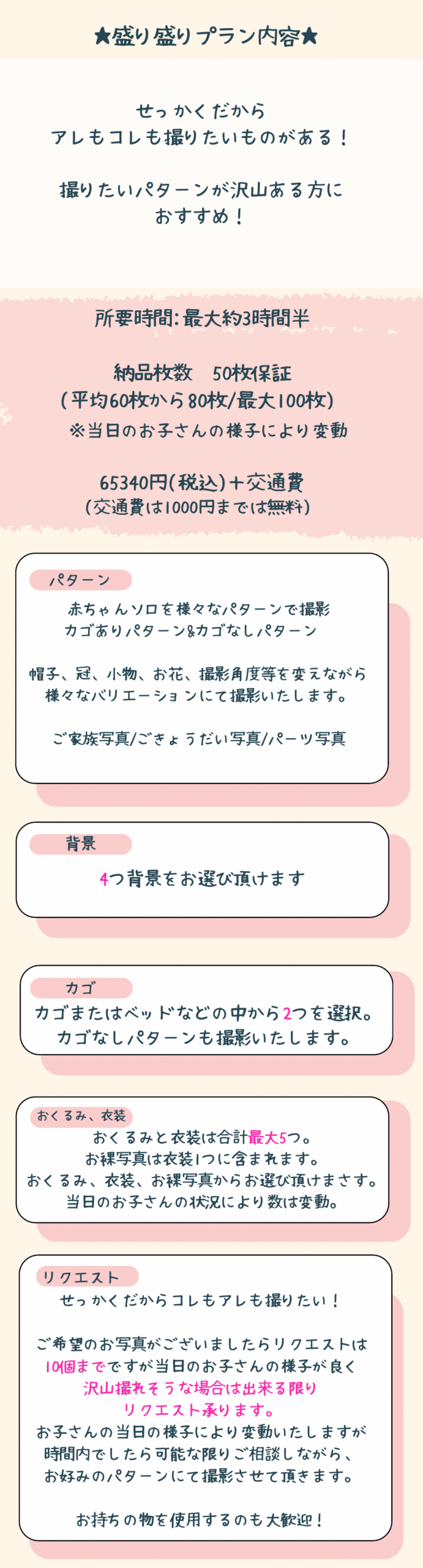⑤どのコースも納品枚数50枚保証でございますが撮影内容等が変わります。(平均60枚から80枚/最大100枚)当日のお子さんの様子により変動いたしますが沢山撮れた場合は沢山お渡ししております。